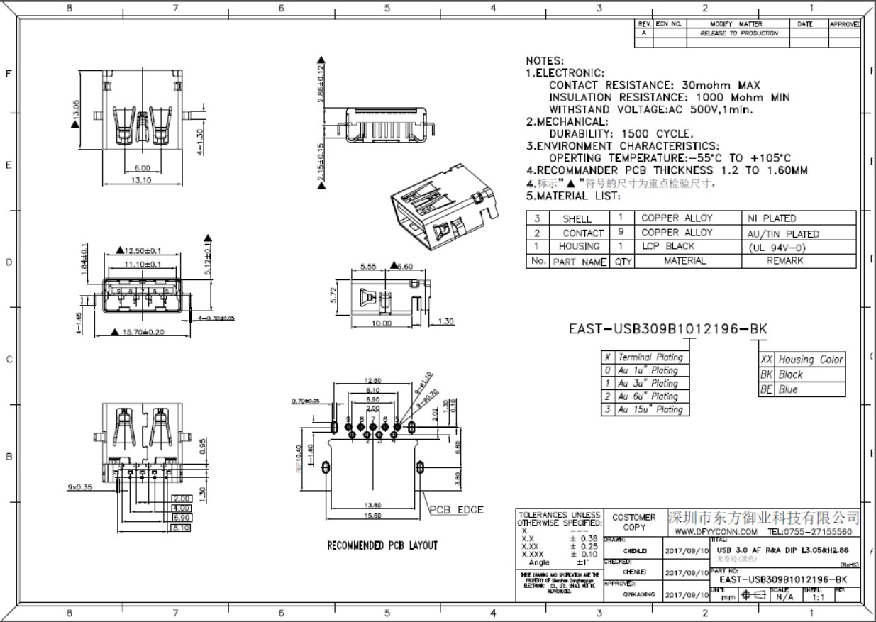 型號:USB 3.0 AF沉板板上H2.86無卷邊L13.05 DIP